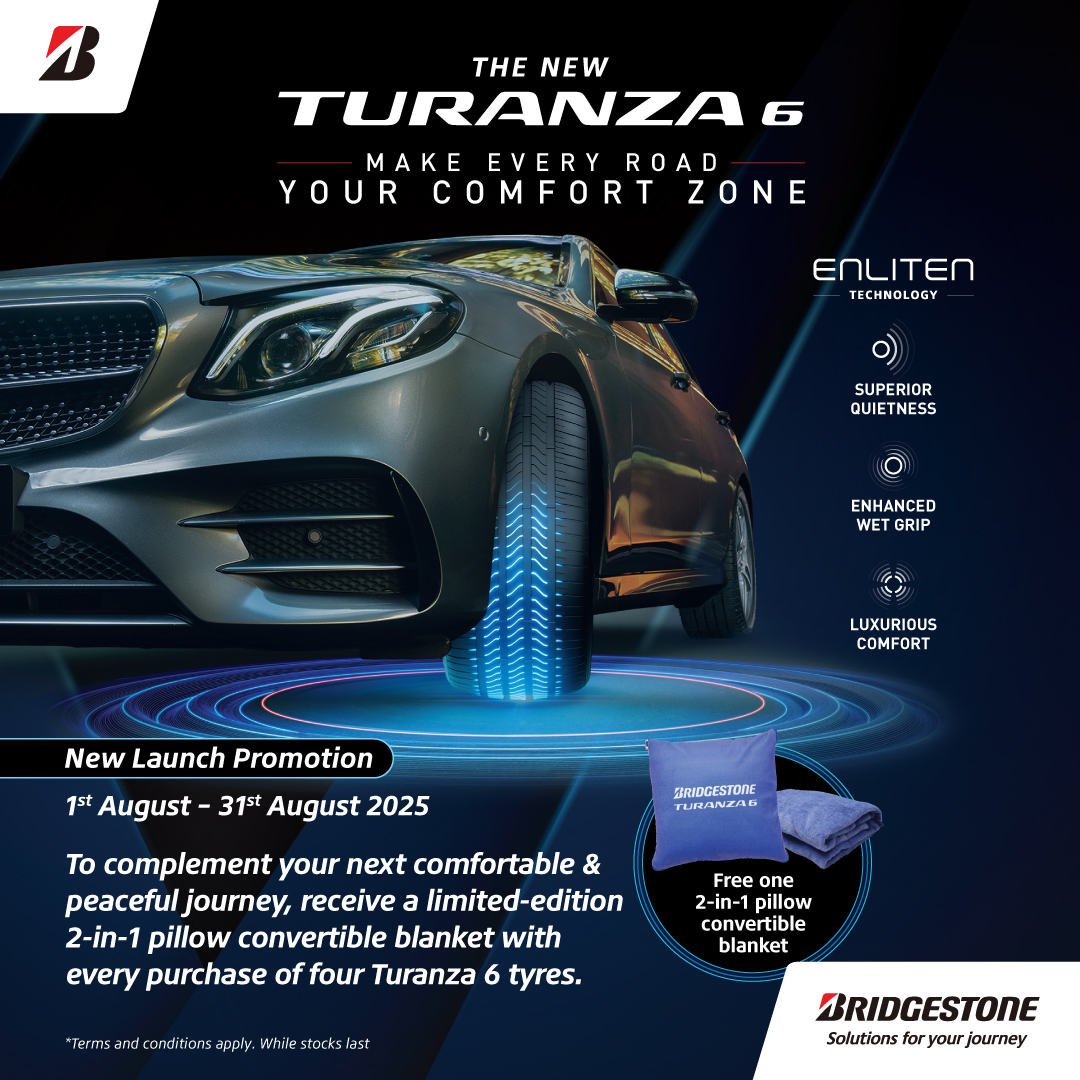 配合新胎上市,Bridgestone也宣布将于8月1日至31日推出促销活动,凡于授权门市一次性购买四条TURANZA 6轮胎,即可获赠限量版2合1枕头毯(数量有限,送完即止)。详情与参与门市可浏览:www.bridgestonetyre.com.my。(整理报道:蔡金璇 Sean Chua)