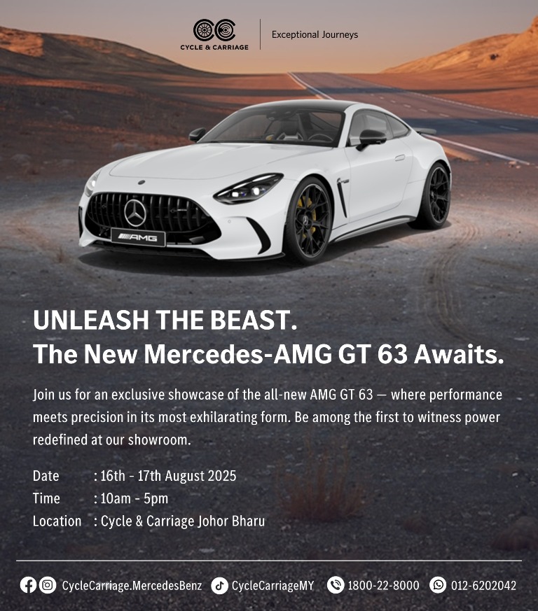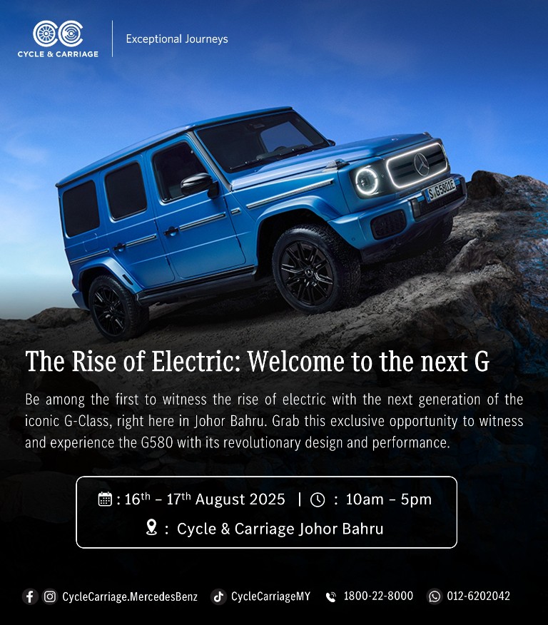 8月16日至17日,C&C柔佛新山展厅将迎来纯电版马赛地奔驰G580的首次本地亮相。这款将G-Class经典元素与电动创新融合的豪华越野车,预览机会极为有限,车迷可趁机近距离欣赏。此外,现场还将展出全新马赛地奔驰GT 63 Coupé,带来性能与豪华兼具的视觉体验。