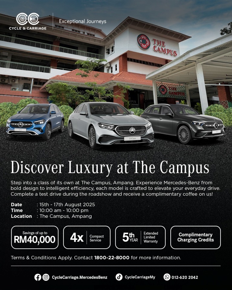 8月15日至17日,安邦The Campus将展示GLC 350e SUV与E350e,并提供E200、GLC Coupé及GLA 250的试驾机会。完成试驾的客户可获赠精品咖啡。C&C还推出特别车主礼遇,包括最高4万令吉优惠、4次精简保养、5年延长有限保修,以及免费充电额度(附带条款)。